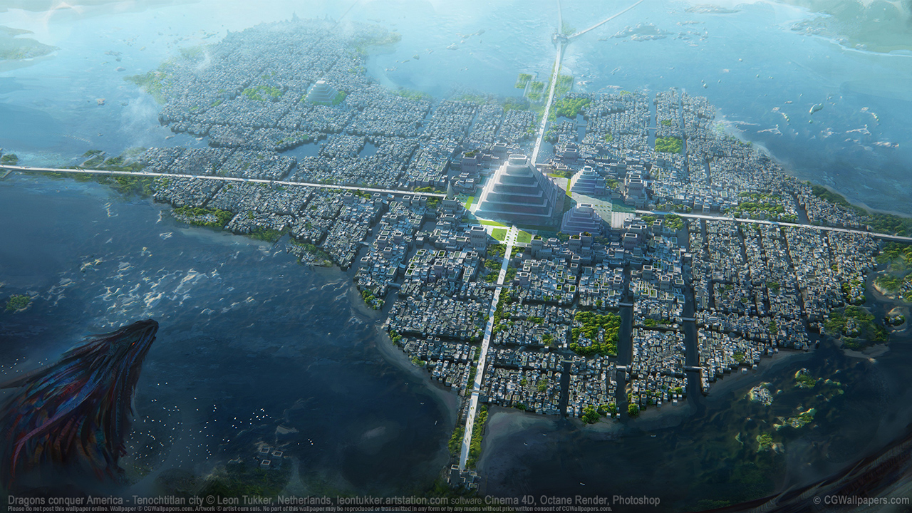 Dragons conquer America - Tenochtitlan city © Leon Tukker, Netherlands software Cinema 4D, Octane Render, Photoshop